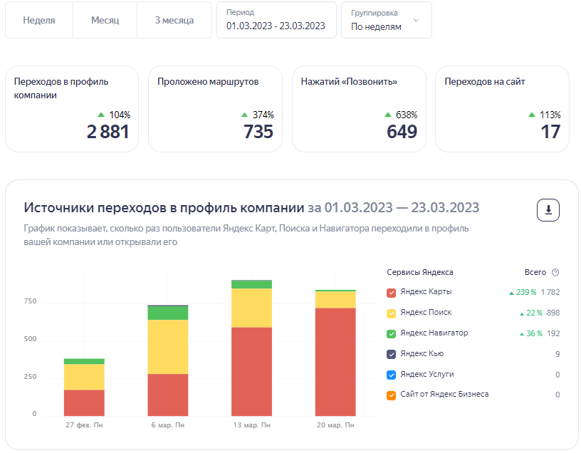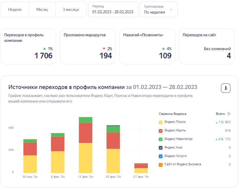 Мы подключим Яндекс.метрику и подменный номер, чтобы детально отслеживать количество новых заявок и активности карточки компании.